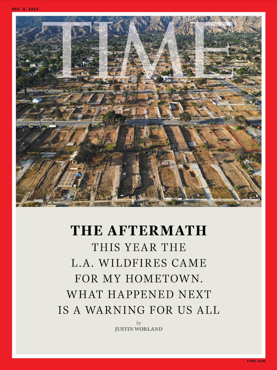 We’ve seen a lot of media coverage in recent months. Some of it has been excellent. The Los Angeles Times has consistently stayed on this story, and Steve Lopez’s November 5 op-ed, Bungled warnings hit weary Eaton and Palisades fire victims like ‘a sucker punch’ which I’m quoted in, cut through the spin with honesty. Justin Worland’s TIME Magazine December 8 cover story Amid the Ashes did the same (Stephen and I are both quoted in there).